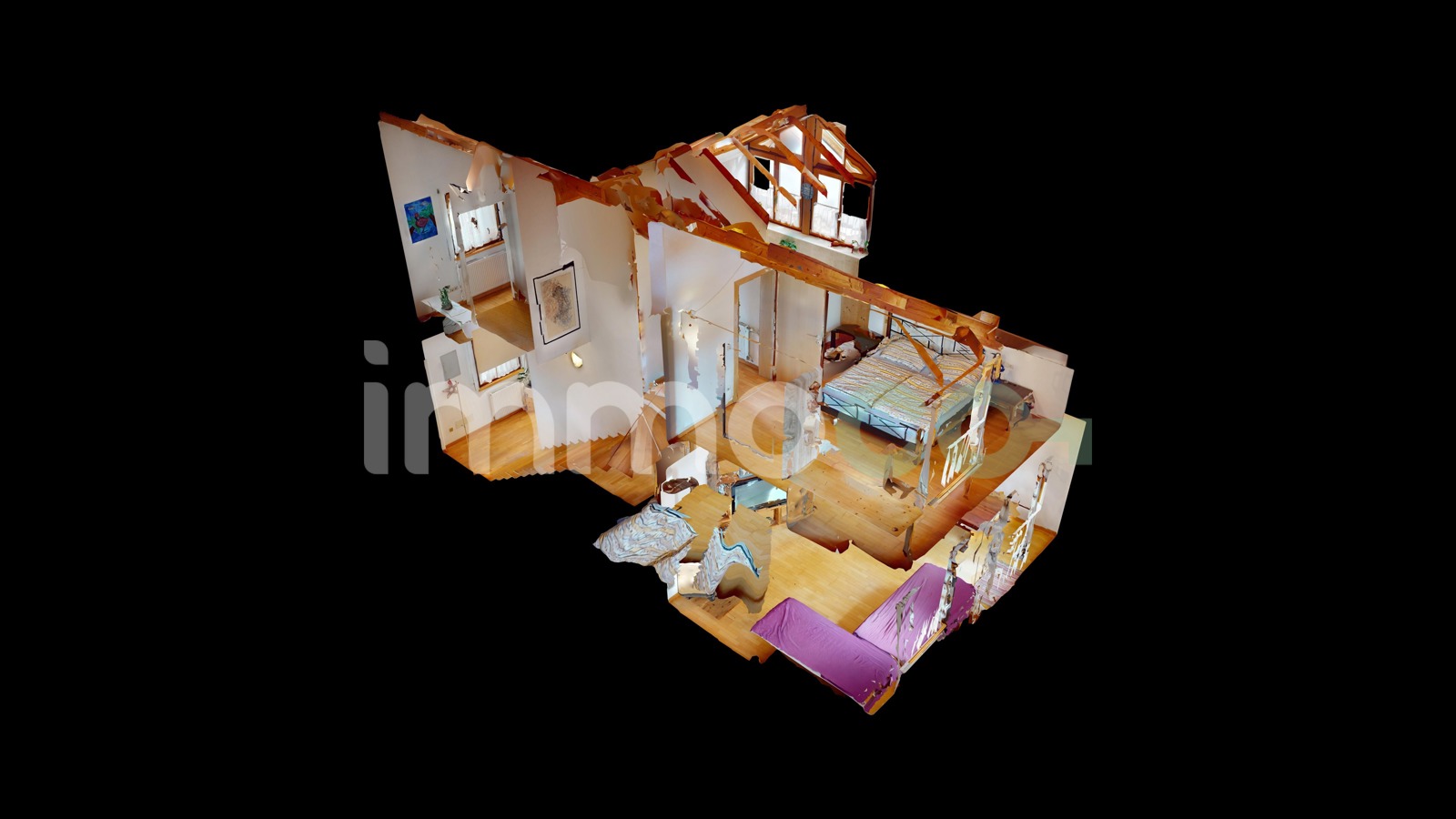 The property is arranged over two levels. On the main floor it features a spacious living area with fireplace, a separate eat-in kitchen, an entrance hall, and a bathroom with window. An internal staircase leads to the attic night area with two bedrooms and a second bathroom.