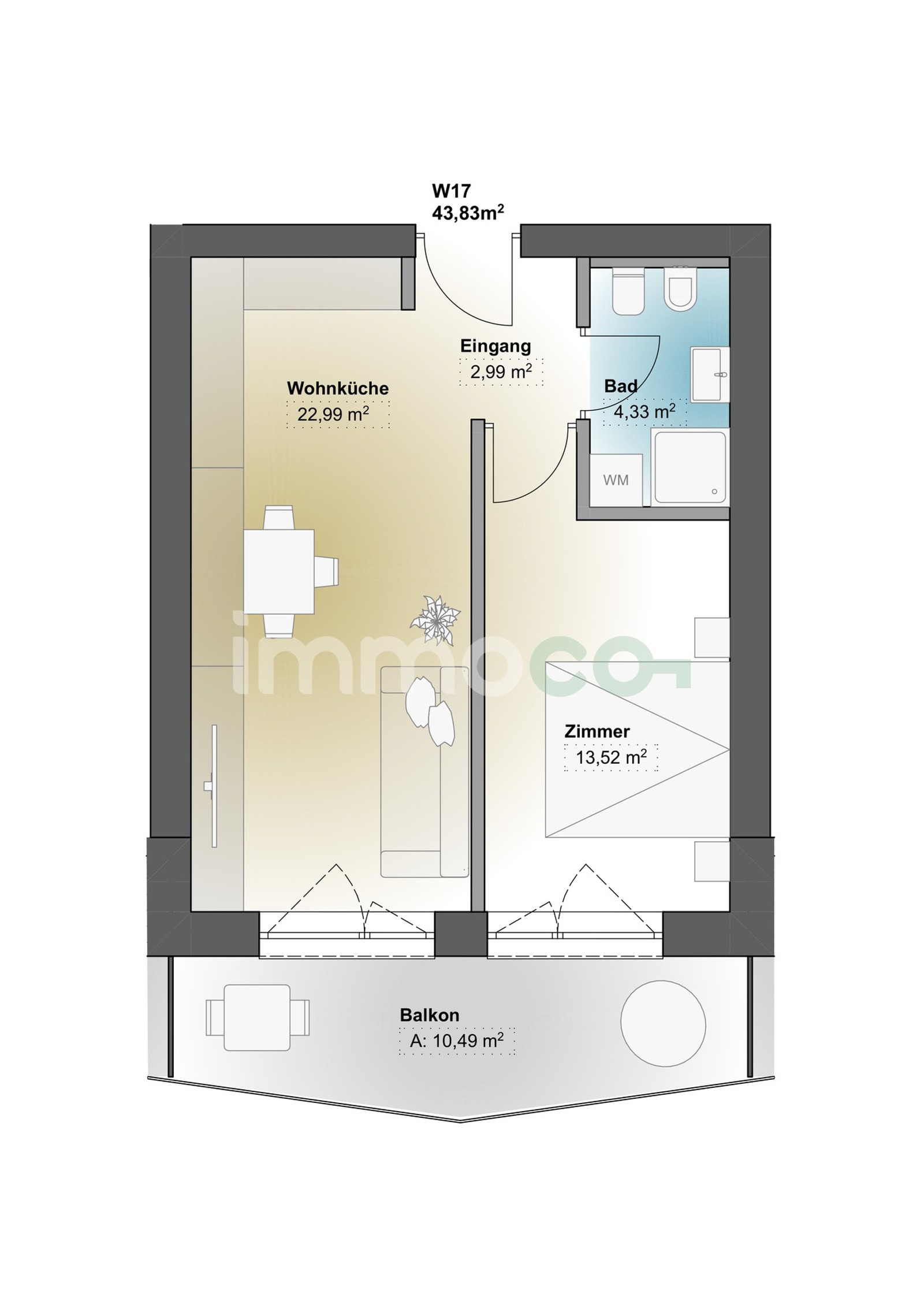 L’unità si compone di un ingresso accogliente, una camera da letto, un bagno elegante e una luminosa zona giorno con angolo cottura. Punto di forza è l’ampio balcone esposto a sud con vista aperta e panoramica — perfetto per godersi il sole e momenti di relax all’aria aperta.