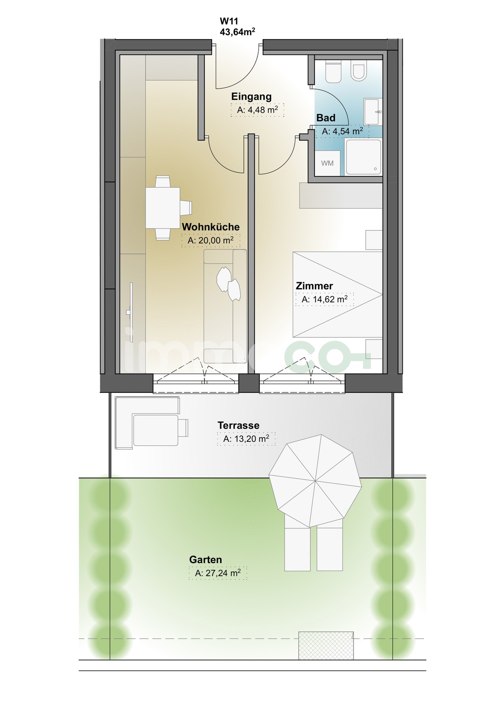 Die Wohnung überzeugt durch einen hellen, offenen Wohnbereich mit Kochecke, ein einladendes Schlafzimmer, ein Badezimmer sowie einen praktischen Eingangsbereich. Besonders hervorzuheben sind die großzügige Terrasse und der private Garten – ideal zum Entspannen, Spielen oder geselligen Stunden im Freien.