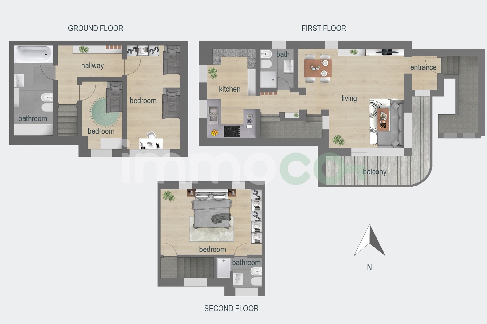 Die Haushälfte erstreckt sich über drei Etagen und besteht aus zwei Schlafzimmern und einem Bad im Erdgeschoss. Eine Treppe führt in den ersten Stock mit Eingang, Wohnzimmer, Küche, Bad und großem Balkon. Im Dachgeschoss befinden sich ein Schlafzimmer und ein weiteres Bad.