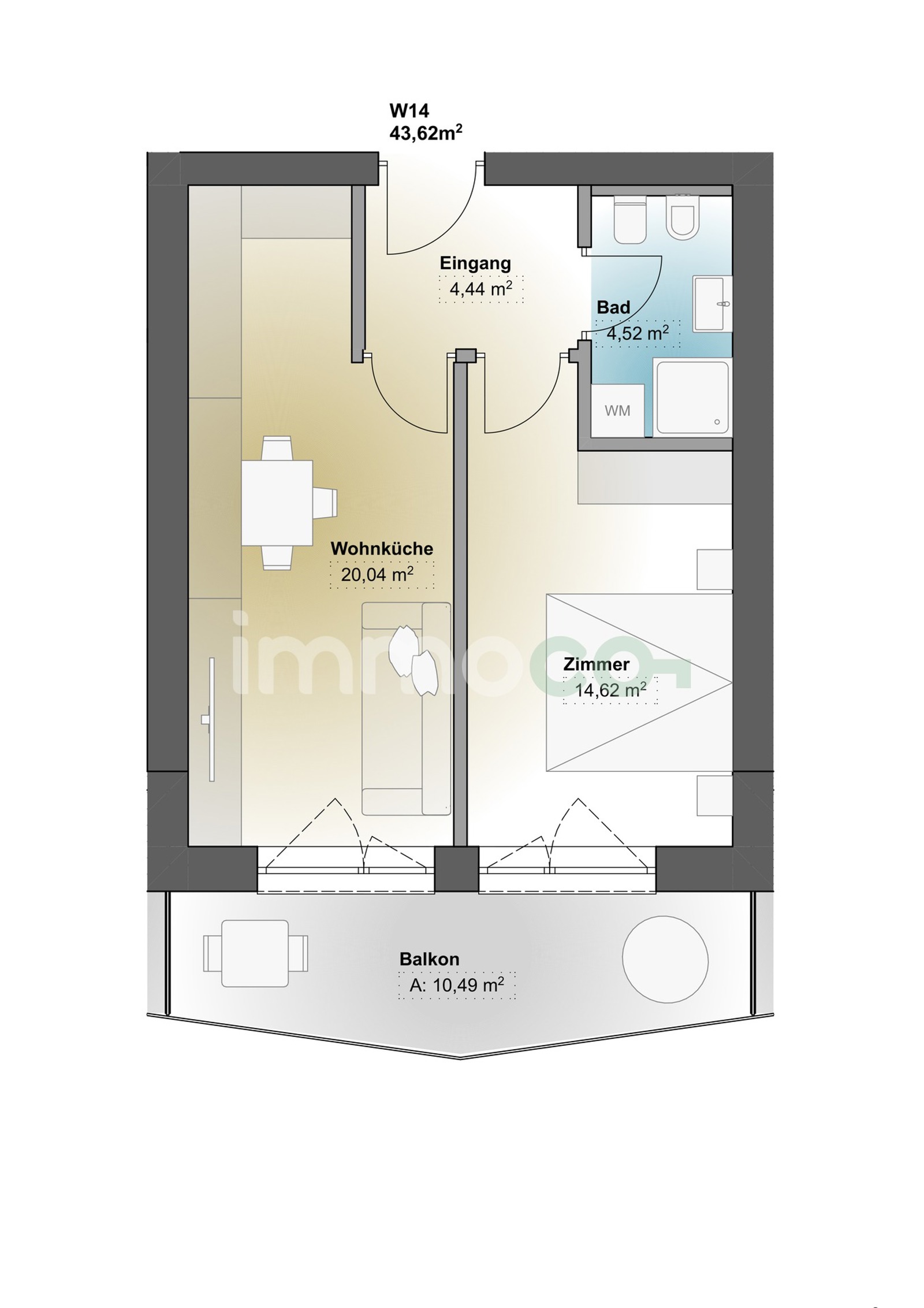 Die Wohnung überzeugt durch einen hellen, offenen Wohnbereich mit Kochecke, ein einladendes Schlafzimmer, ein Badezimmer sowie einen praktischen Eingangsbereich mit großem Balkon nach Süden.