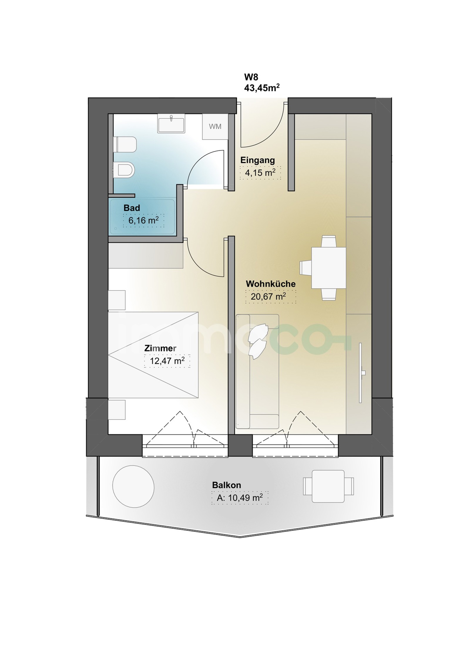 Die Wohnung verfügt über einen einladenden Eingang, ein Schlafzimmer, ein stilvolles Badezimmer sowie einen hellen Wohnbereich mit Kochecke. Besonders hervorzuheben ist der großzügige, nach Süden ausgerichtete Balkon mit freier Aussicht – perfekt für sonnige Stunden und entspannte Momente im Freien.
